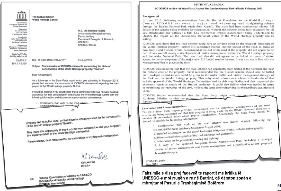 Nga shqyrtimi i Raportit të subjektit shtetëror të Parkut Kombëtar të Butrintit në Shqipëri në shkurt 2013, ku si kusht vihet që të zbatohet projekti rrugor, veçanërisht në lidhje me rekomandimet e Komisionit të Këshillimit të ICOMOS / UNESCO (24-26 gusht 2010), del se nuk janë zbatuar rekomandimet e tij. Komisioni Këshillues ka bërë 10 rekomandime, 4 prej të cilëve janë komentuar në këtë raport.